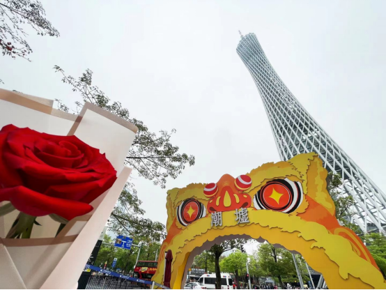 潮墟门口,一个长9米宽5米的醒狮艺术装置"奇狮意想"屹立,狮头双目炯炯有神,神态威武又自带萌气质。该装置由广州美术学院青年艺术家郑以文创作,并由两位从格拉斯哥艺术学院毕业回国的青年策展人陈佩莹、邢雨联合策划。醒狮"盘踞"在门口迎接八方来客,为前来游玩的市民游客送上福瑞。