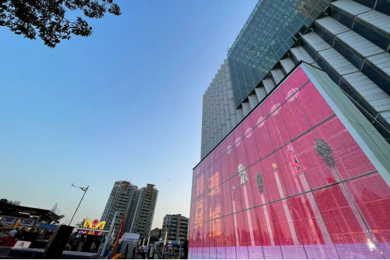 潮墟正门入口处的超透LED大屏幕整体尺寸为长21.2米、高10.9米,用于公益宣传视频的播放。屏幕前方广场区域设有日常表演小舞台,由潮墟团队打造运营,高频次呈现音乐、舞蹈、时尚走秀、脱口秀、快闪等形式多样的文娱活动,并不定期在各大平台直播,为市民游客带来有趣有料的活动。舞台和广场区域约400平方米,可用于开幕式、启动仪式、节目表演等活动。